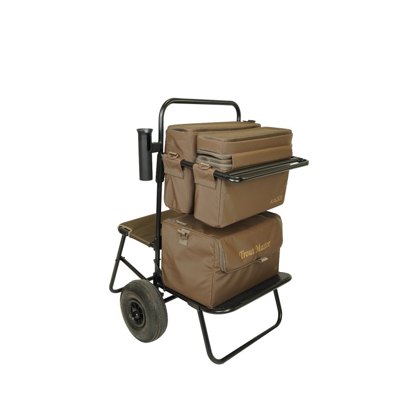 Der Kaddi von Trout Master ist die perfekte Lösung für alle, die ihre Angelausrüstung am Forellensee ordentlich und platzsparend verstauen wollen. Egal, ob Tackle, Ruten oder Köder, alles hat seinen Platz! Der Kaddi umfasst neben einem leichten Alugestell mit integriertem Sitz und zwei Rutenhaltern auch drei Taschen.
