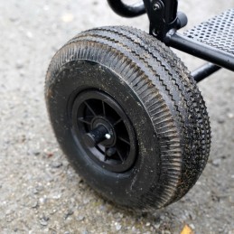 Die Räder haben eine Größe von 26 cm, was perfekt für unwegsames Gelände ist. Sie können mit dem Push-Pin einfach abgeklemmt und wie ein Fahrradrad aufgepumpt werden. Ideal für unwegsames Gelände wie Kies oder Matsch.