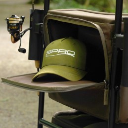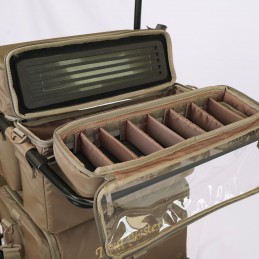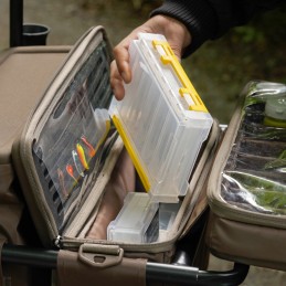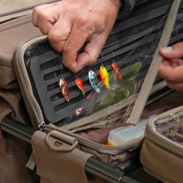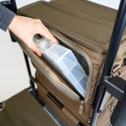 Die erste Tasche ist eine praktische Accessoire-Tasche, die mit einer stabilen Ablagefläche ausgestattet ist und über den Rücken zugänglich ist. In der zweiten Tasche findest du eine Tackle-Tasche mit einem eigenen Fach für Pasten und Köder, das sich einfach aufklappen lässt und stabil auf dem Rahmen liegt. Unter dem Deckel hast du ein großes EVA-Board und eine Abdeckung, um deine Spoons oder Hardbaits ordentlich zu organisieren. Darunter befindet sich noch Platz für Boxen. Die dritte Tasche ist eine isolierende Kühltasche, die sich am unteren Teils des Kaddis befindet und vor direkter Sonneneinstrahlung schützt. Von vorne lässt sich die Kühltasche ganz bequem öffnen, um schnell an Snacks, Getränke oder einen Fang zu kommen. Alle Taschen lassen sich dank des mitgelieferten Schultergurts auch einzeln nutzen; so, wie du es gerade brauchst.