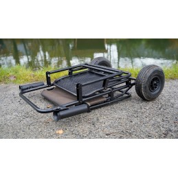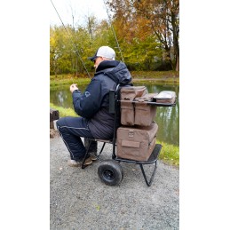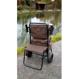 Auf der Rückseite des Kaddis befindet sich ein umklappbarer Stuhl, und an den Seiten hast du zwei stabile Ruten- und Kescherhalter. Perfekt, um sowohl stationär als auch aktiv auf Salmoniden am Forellenteich zu fischen. Die großen, luftgefüllten Gummireifen machen den Kaddi auch in schwierigem Gelände mobil. Alle Taschen können abgenommen werden, und der Trolley lässt sich einfach zusammenklappen, sodass du ihn platzsparend verstauen kannst.