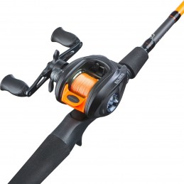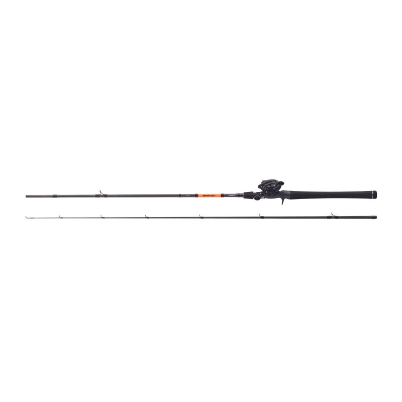 Rolle: Shirasu Baitcast, 7 Kugellager plus 1 Nadellager, Aluminium-Weitwurfspule, Microdisc-Bremssystem, bespult mit Iron Line 8 orange 0,16 mm, Schnurfassung: 165m 0,16mm, Gewicht 170g, Übersetzung 6,5:1.