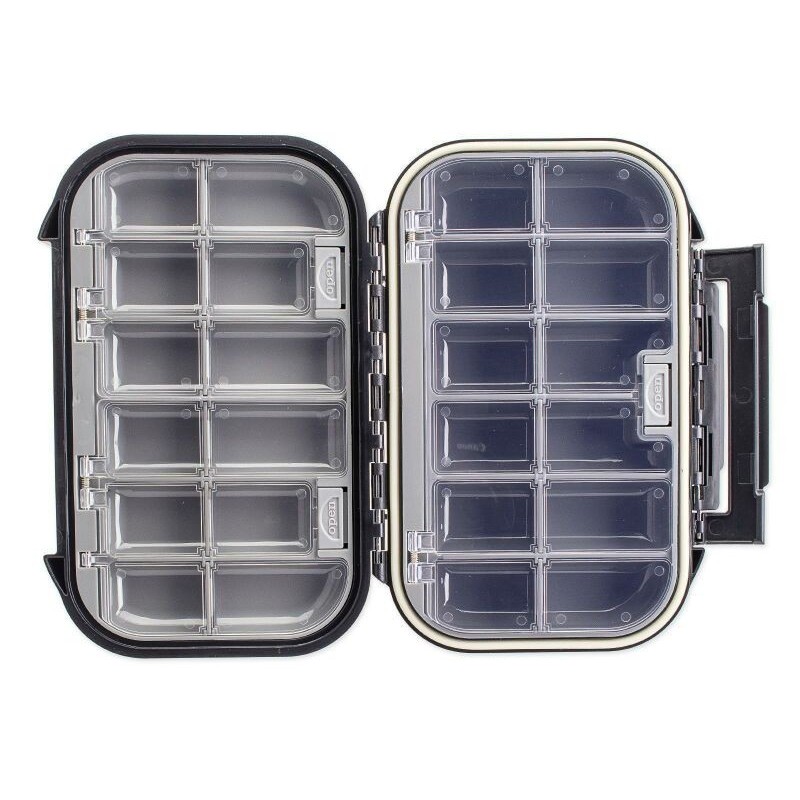 Haken, Perlen, Stopper, Weights, Wirbel & Co - alle Kleinteile, die zum Finesse-Fischen nötig sind, finden in dieser praktischen Box ein sicheres Plätzchen. Die CAMO Lures Finesse Tackle Box TBX-200 wird aus schlagfestem Kunststoff gefertigt und verfügt über eine robuste, einhändig bedienbare Schließe sowie eine umlaufende Gummidichtung gegen das Eindringen von Wasser. Die Fächer im Innenraum der durchdachten Box werden nochmals von exakt eingepassten Klarsichtdeckeln verschlossen, die sich dank Federmechanismus auf Knopfdruck öffnen. Hier kommt kein noch so kleines Zubehörteilchen versehentlich raus! Für Ordnung sorgen insgesamt 12 flache und 12 etwas tiefere Fächer. Sie sind jeweils mittig durch eine herausnehmbare Trennwand unterteilt, können daher nach Bedarf auf doppelte Länge vergrößert werden. Abgerundete Ecken erleichtern die Entnahme kleiner Teile.