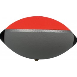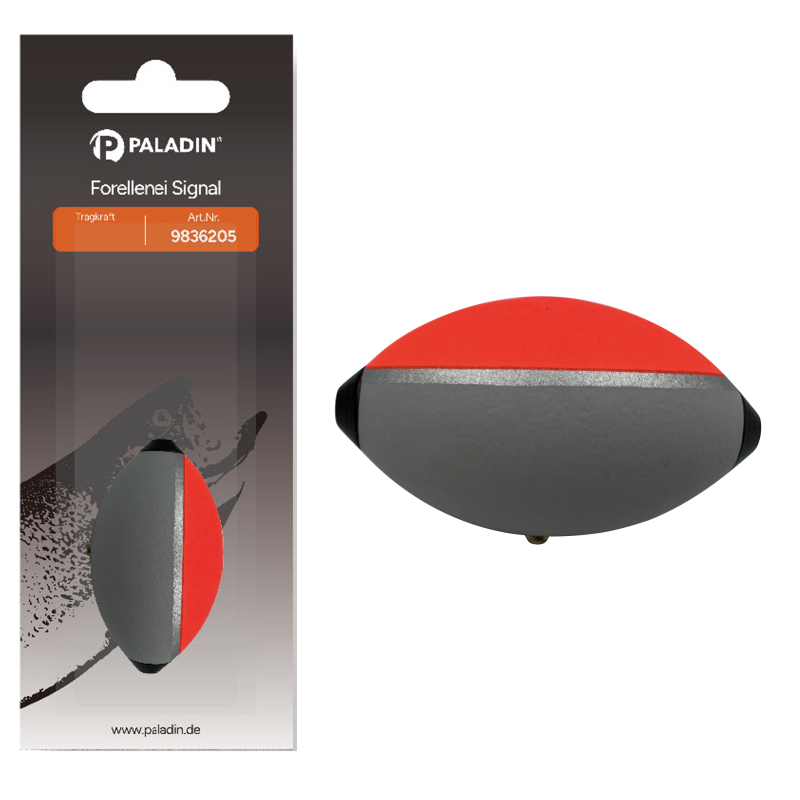 Vorbebleites Forellenei zum Oberflächenangeln am Forellensee. Dank des Beschwerungspunktes ist die unauffällige graue Seite im Wasser und die Signalrotefarbe zeigt nach oben.